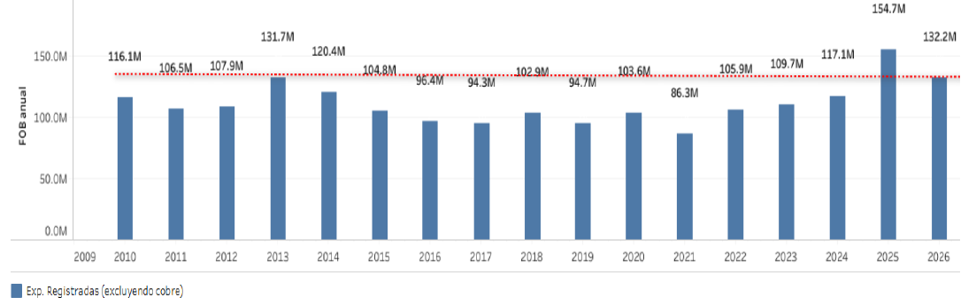 1. Las exportaciones registradas hasta febrero del año 2026 ascendieron a un total de B/. 132.2M.