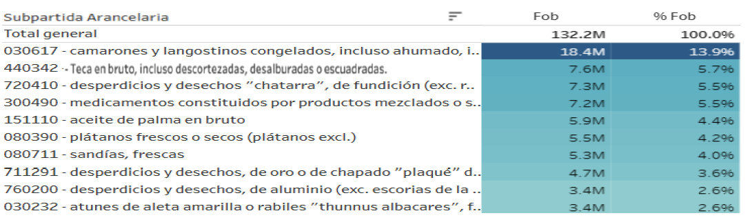 A nivel de subpartidas arancelarias (código internacional estandarizado del Sistema Armonizado a 6 dígitos), las exportaciones de camarones congelados se mantuvieron liderando las exportaciones al mes de febrero del año 2026, seguidas por las de teca en bruto, la chatarra, medicamentos y aceite de palma en bruto, mientras que el banano, afectado por la huelga laboral del año pasado, cae al sexto lugar. En las últimas posiciones del Top-10 se ubican las sandías, otros desperdicios metálicos y los atunes de aleta amarilla. Estas 10 fracciones arancelarias representan el 52% de nuestras exportaciones registradas.