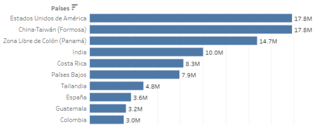Al mes de febrero de 2026, nuestros principales destinos de exportación reflejan un virtual empate en el primer lugar entre los Estados Unidos de América y Taiwán (ambos con 13.5% del total exportado), Zona Libre de Colón (11.1%), India (7.6%), Costa Rica (6.3%); manteniendo a Países Bajos en el sexto lugar (6.0%). Es útil tener en cuenta que, en el acumulado de los años 2023 a 2025, EUA había sido el principal destino de nuestras exportaciones. La tabla del Top-10 de nuestros principales mercados la completan Tailandia (3.6%), España (2.7%), Guatemala (2.4%) y Colombia (2.3%). Estos 10 mercados acreditaron el 68.9% de las exportaciones registradas panameñas.