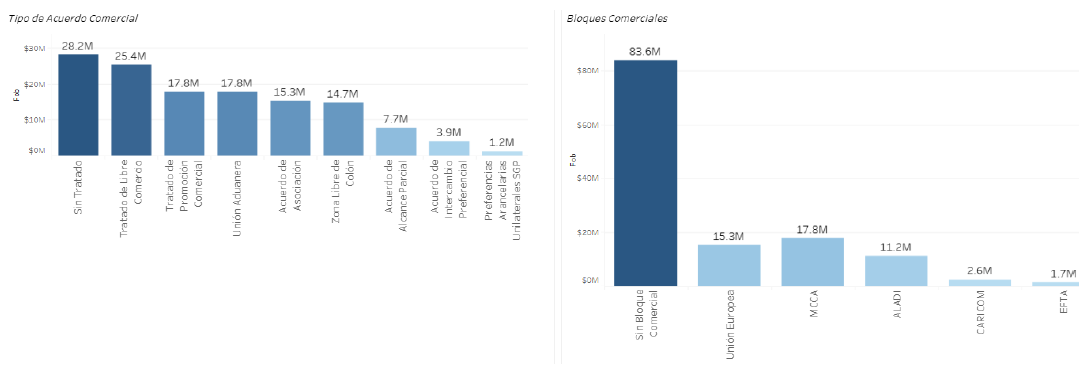 El 67.5% de nuestras exportaciones durante los dos primeros meses del año en curso, se vendieron a países con los que tenemos algún acuerdo comercial vigente y 63.2% a países que no forman parte de algún bloque comercial. En el caso de bloques comerciales como destino de nuestras exportaciones, 13.5% de ellas van al Mercado Común Centroamericano (MCCA), manteniendo en el segundo lugar a la Unión Europea (11.6%), seguido por la Asociación Latinoamericana de Integración (ALADI) con 8.5%, CARICOM (2.0%) y la Asociación Europea de Libre Comercio (1.3%).