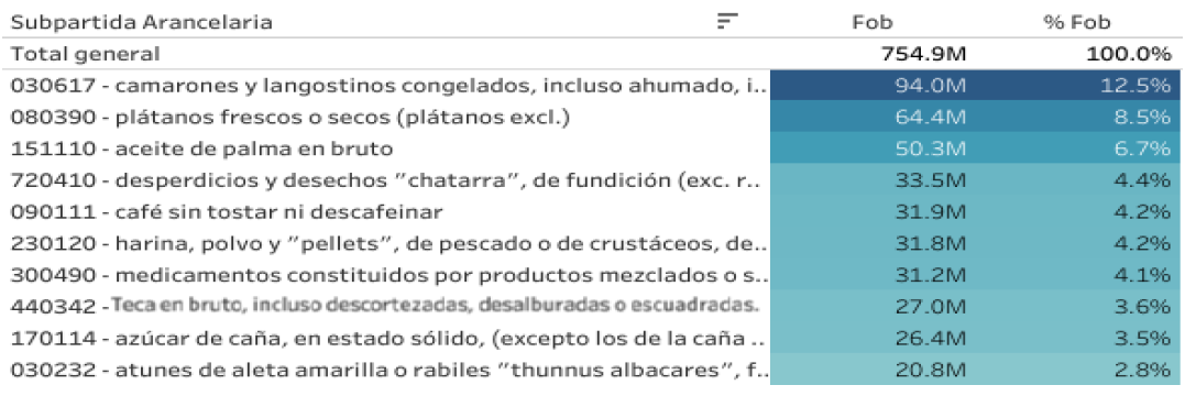 A nivel de subpartidas arancelarias, hasta septiembre las exportaciones son lideradas por las de camarones congelados con 12.5%, seguidas por las de banano que ahora representan el 8.5% (luego de haber representado el doble en los primeros meses del año), y en tercer lugar se ubican las de aceite de palma en bruto con 6.7%. Las 10 principales fracciones arancelarias representan el 54.5% de nuestras exportaciones registradas.