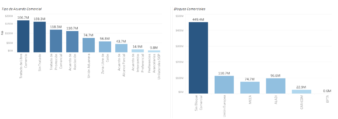 El 71.4% de nuestras exportaciones acumuladas a agosto del año en curso, se vendieron a países con los que tenemos algún acuerdo comercial vigente y 59.5% a países que no forman parte de algún bloque comercial. En el caso de bloques comerciales como destino de nuestras exportaciones, 14.7% de nuestras exportaciones van a la Unión Europea, seguido por la Asociación Latinoamericana de Integración (ALADI) con el 12.8% y 9.9% para el Mercado Común Centroamericano (MCCA).