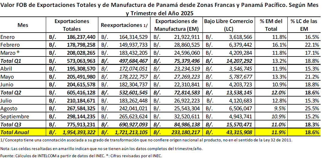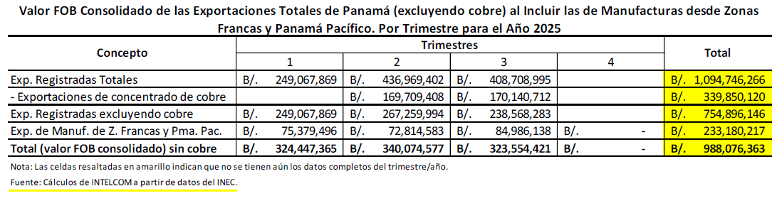1. Las exportaciones registradas hasta septiembre de 2025 ascendieron a un total de B/. 754.9M1